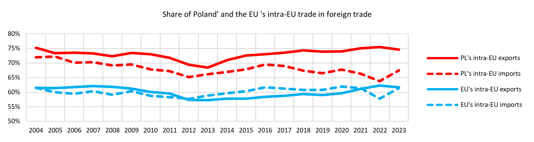 From the moment it joined the EU, Poland had strong trade relations with the other Member States – in 2004, their share in Poland’s total exports was 75.2% and in imports 72%, while for the EU it was 61.5% each. After a period of decline in 2012-2013, the concentration of Polish sales on the EU market returned to the level of 20 years before in 2023, although in the case of imports it reached a slightly lower level – around 68%. Taking into account that the average share of intra-EU trade remained at just over 60%, this means that the level of Poland’s integration into the EU through trade in goods has definitely increased (the decline in the importance of EU imports in Poland’s trade was mainly due to two reasons: exchange rate fluctuations and changes in the position of the main non-EU partners – China and the US).