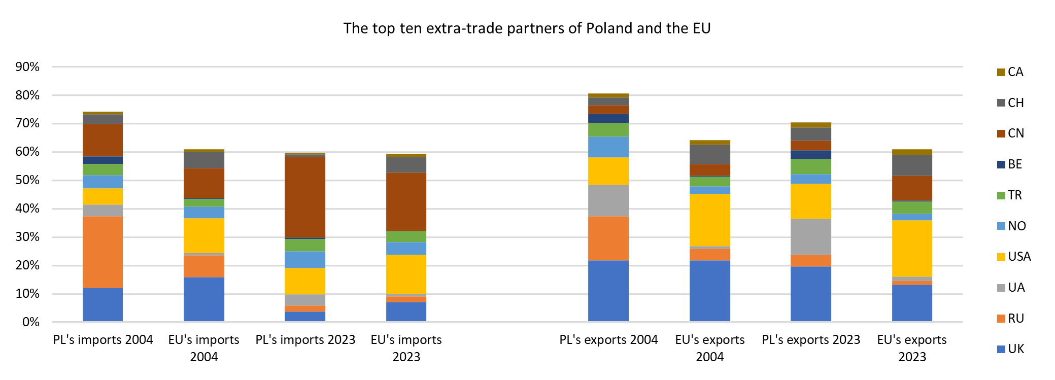 As for trade with non-EU countries, when Poland joined the EU 21 years ago, the main recipients were the United Kingdom (then still within the Union), Russia, Ukraine, the United States and Norway. However, the list changed dramatically: the importance of Russia and Norway decreased in favour of Turkey and Switzerland in 2023. The geographical structure of Poland’s extra-EU imports was slightly different: in the year of accession, Russia, the United Kingdom, China, the United States and Norway were the main suppliers. In recent years, in line with the global trend, China has clearly dominated Poland’s imports, the US has a significant position and, due to the energy embargo, Russia’s place has been taken by Norway, followed by Turkey and Ukraine. The above list, with slight differences in the positions of Switzerland and Ukraine, is consistent with the geographical structure of extra-EU trade, indicating Poland’s effective integration into the system of contractual trade agreements concluded by the EU with third countries.