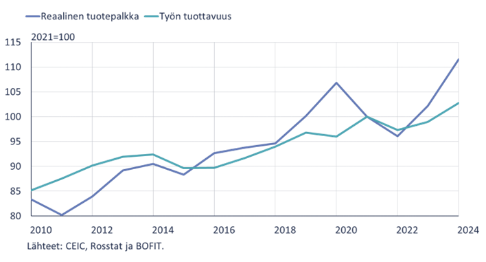 Työvoimapulaan selkein ratkaisu on kasvattaa tuottavuutta. Venäjällä työn tuottavuus on kuitenkin kehittyneitä maita merkittävästi alhaisemmalla tasolla ja kehittynyt heikosti. Taloustieteellisen teorian mukaan reaalisen tuotepalkan kasvun tulisi vastata korkeintaan tuottavuuden kasvua [3], jotta palkkojen kasvattaminen olisi kokonaistaloudellisesti kestävää. Venäjällä tämä ero on revennyt sodan aikana lähelle koronapandemian tasoa: vuonna 2024 reaalisen tuotepalkan taso oli 12 % korkeampi kuin vuonna 2021, kun taas työn tuottavuus oli kasvanut vain hieman alle 3 %. Näin heikko työn tuottavuuden kehitys on poikkeuksellista tilanteessa, jossa talouskasvu on ollut huomattavan nopeaa.