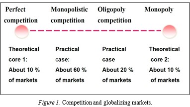 Joseph Schumpeter at Harvard (1932-1950) gave economists food for thought with the concept of creative destruction. He claimed that an innovative transformation in a capitalistic society is a conflict-ridden process, and entrepreneurs are the heroes of the drama. Schumpeter introduced the concept of temporary monopoly profit as the lifeblood of innovativeness. His student Edward Chamberlin at Harvard (1937-1967) made significant contributions to microeconomics, particularly on competition theory. He constructed the theory of monopolistic competition in which differentiation is a firm´s best response to a downward sloping demand curve, and when there are many firms or many competing products that are close substitutes in nature and many specialty brands. Monopolistic competition is modified by a German economist Erich Gutenberg (1987-1984). His monopolistic scope concept (monopolistische bereich) advises firms to specialize in narrow market segments. This is the market strategy that German and Nordic SMEs follow in global competition. Monopolistic competition is rewarding in globalizing markets and 60% of the total (Figure 1). In Paul Krugman’s writing (1979, 1995) monopolistic competition and differentiation are the two main drives of trade. Chamberlin’s contribution has been fundamental to the trade-driven global economy, although not accepted by most of orthodox economists (Lahti, 2010, 2012, 2020, Lahti, Talvela, Rajala, 2023).