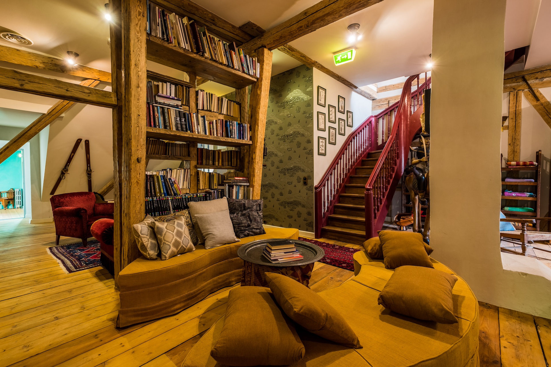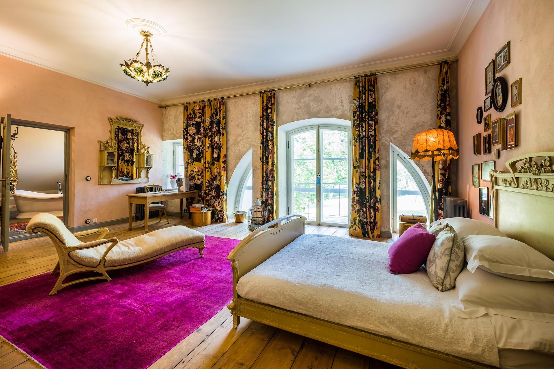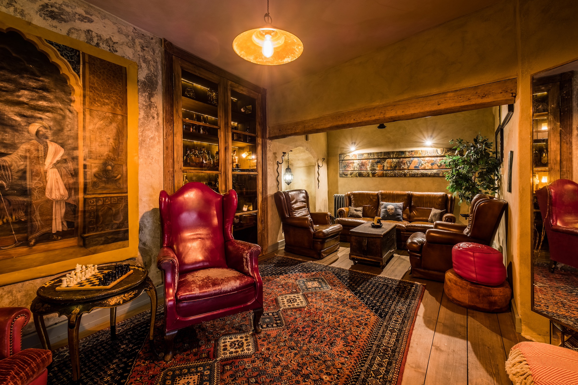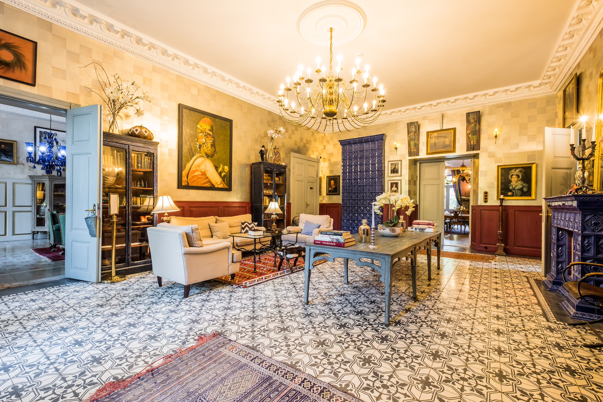 Pysäytämme auton päärakennuksen pylväskäytävän eteen ja astumme ulkoisesti hillittyyn rakennukseen. Täällä, seinien välissä, avautuu aivan erilainen maailma, upea ja eklektinen. Se on todellinen maailmanmatkaajan koti, johon kaikki ovat tervetulleita, jossa jokainen huone, antiikkihuonekalu, historiallinen maalaus ja veistos kertoo oman tarinansa. Kiehtovat tapetit, majesteettiset verhot ja runsaat matot lisäävät viihtyisyyttä huoneisiin. Alkuperäiset kattopalkit, puiset pylväät ja savupiiput lumoavat ja uunit sekä takat tuovat miellyttävää lämpöä.